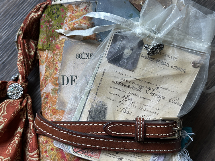 I got into junk-journaling a year or so ago. A ‘junk journal’ is one that is handmade from found materials, like envelopes, books, ephemera, and paint, fabric, trims and other embellishments. Tearing up tiny bits of paper is relaxing, and meditative and now it is part of my art process.